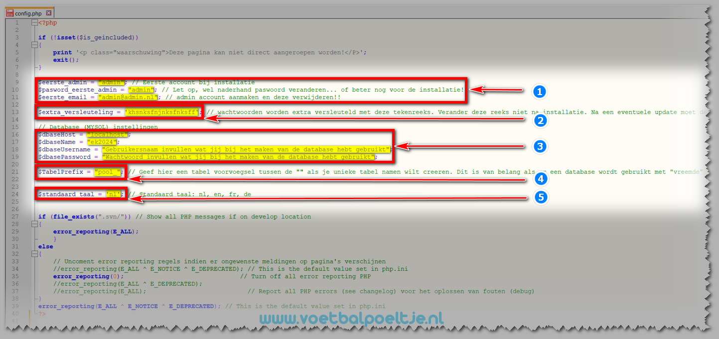 Database (MYSQL) instellingen in config.php (zie afbeelding -punt 3):