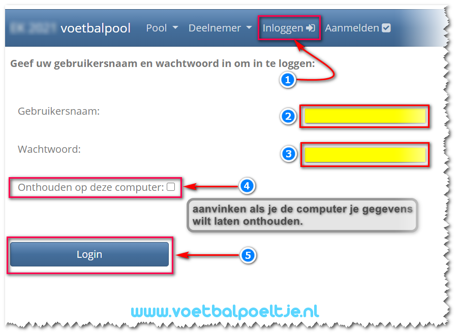 Nadat een deelnemer zich heeft aangemeld en zijn account is geactiveerd dan kan deze deelnemer inloggen op de inlogpagina van de pool.