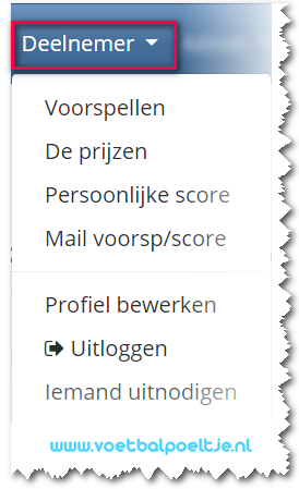 Indien een deelnemer is ingelogd verschijnen er in het linker menu van de pool een aantal extra menukeuzen welke onder de kop “deelnemer” zichtbaar worden: