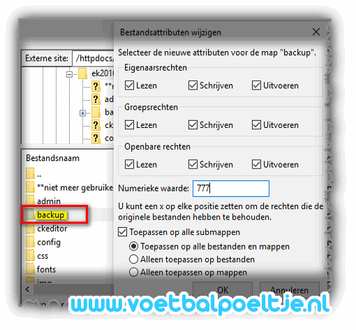 (Via FTP kan je controleren of de bestandsrechten op 777 staan). Indien de rechten van deze directory niet goed zijn ingesteld, zullen er bij het maken van een back-up foutmeldingen worden weergegeven.